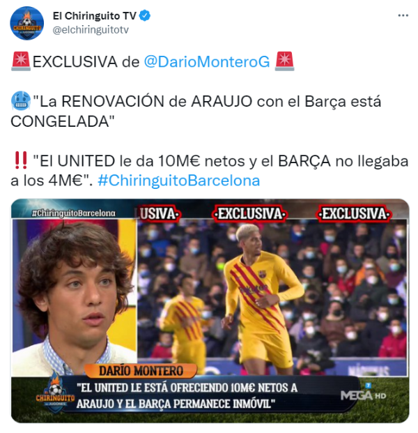 “Hay un equipo de la Premier, Manchester United, que no deja de llamar y le está dando 10 millones de euros netos a Araújo. Hubo un primer acercamiento entre el Barça y su agente y la oferta de renovación del Barça no llegaba a los 4 millones de euros al año. Araújo sabe que tiene compañeros con salarios inflados, que ni juegan“, cerró Montero.
