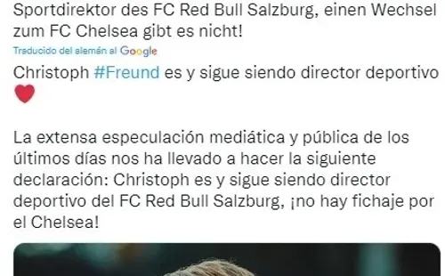 “Christoph Freund es y sigue siendo director deportivo La extensa especulación mediática y pública de los últimos días nos ha llevado a hacer la siguiente declaración: Christoph es y sigue siendo director deportivo del FC Red Bull Salzburg, ¡no hay fichaje por el Chelsea!”, fue lo dicho en redes sociales por parte del club austriaco.