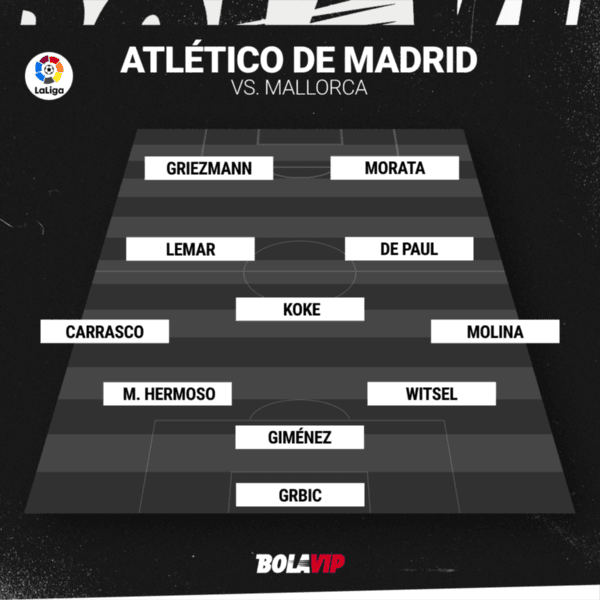 Ivo Grbic; Nahuel Molina,Axel Witsel, José María Giménez,Mario Hermoso, Yannick Carrasco; Rodrigo De Paul, Koke Resurrección, Thomas Lemar; Álvaro Morata y Antoine Griezmann.
