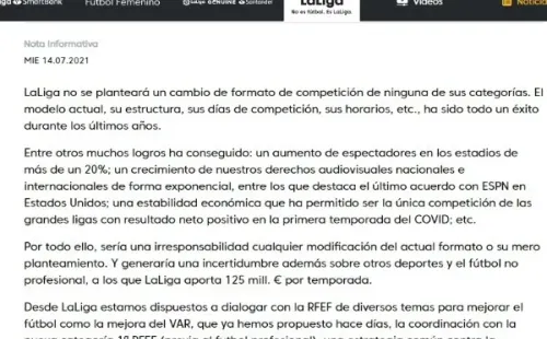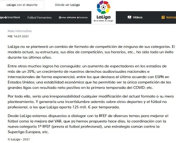“LaLiga no se planteará un cambio de formato de competición… ha sido un éxito durante los últimos años. Sería una irresponsabilidad cualquier modificación actual o su mero planteamiento. Generaría una incertidumbre sobre otros deportes y el fútbol no profesional, a los que LaLiga aporta 125 millones por temporada”, marca el comunicado firmado por el ente.