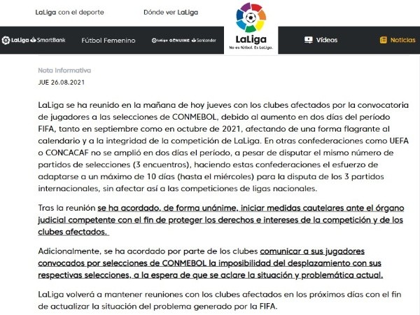 “LaLiga se ha reunido en la mañana de hoy jueves con los clubes afectados por la convocatoria de jugadores a las selecciones de CONMEBOL, debido al aumento en dos días del período FIFA, tanto en septiembre como en octubre de 2021, afectando de una forma flagrante al calendario y a la integridad de la competición de LaLiga”, empezaba el comunicado del ente.
