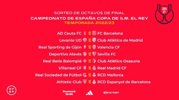 Real Madrid, uno de los candidatos al título, no la tendrá fácil en octavos de final, ya que se las verá con un Villarreal que siempre lo complica. Por su parte, Barcelona enfrentará a la gran sorpresa, AD Ceuta. En tanto, el vigente campeón Real Betis se medirá ante Osasuna. Por último, entre los duelos más destacados, Atlético de Madrid se verá las caras con Levante.