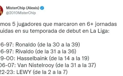 Lo cierto es que con esta diana llegó a 9 goles en la competición liguera Ibérica, y por ahora lidera la tabla de goleo en ese torneo. De acuerdo con información del estadista, Míster Chip, el polaco es el deportista que más rápido marco goles en seis partidos en su temporada debut.