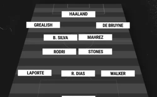 Ederson; Walker, Dias, Laporte; Rodri, Stones, Mahrez, Silva, De Bruyne, Grealish; Haaland.