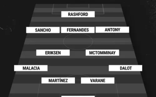 De Gea; Dalot, Varane, Martínez, Malacia; Eriksen, McTomminay; Antony, Fernandes, Sancho; Rashford.