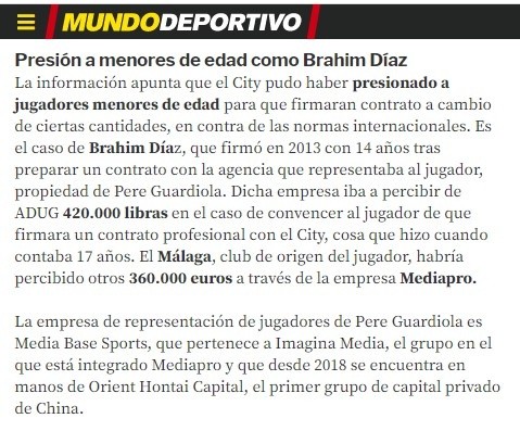 Para ejemplificar aún más el tema, Mundo Deportivo cita que Brahim Díaz fue llevado al límite para firmar con apenas 14 años un contrato con Manchester City donde se le aseguraba un sueldo para cuando fuese mayor de edad, pero donde sobre todo empresas que rodeaban a su agente se llevarían en contra de las normas internacionales hasta medio millón de euros. Con Jadon Sancho y Watford ocurriría lo mismo tal y como desvela Die Spiegel. Terremoto en el Etihad.