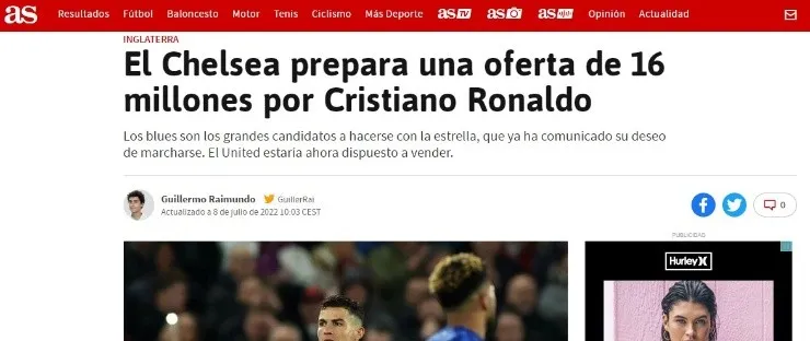 AS se hace eco de las informaciones filtradas por ESPN desde hace días en cuanto al interés de la Premier League por retener los goles del portugués de cara al próximo curso. Con Bayern Múnich descartado y PSG de momento sin moverse, el futuro de Cristiano Ronaldo apunta a continuar por un Reino Unido donde ya hablan de montos para sacarle de Old Trafford.