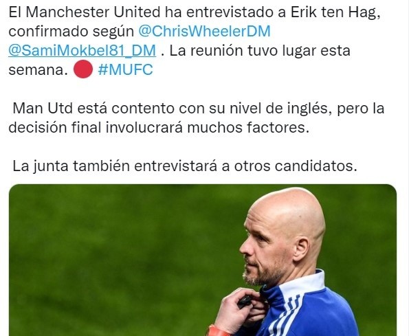 “Durante la reunión, Erik ten Hag quería saber sobre el presupuesto y los planes para el futuro del Manchester United. Su nivel de inglés ahora ha mejorado: ten Hag se siente listo para probar la experiencia de la Premier League pronto”, fueron las palabras del periodista italiano para confirmar al neerlandés como el primer contactado por la dirigencia de los Diablos Rojos.