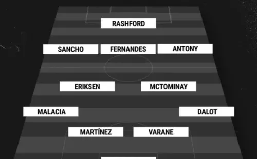 De Gea, Dalot, Varane, Martínez, Malacia; McTominay, Eriksen; Antony, Fernandes, Sancho; Rashford.