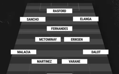 David De Gea; Diogo Dalot, Raphael Varane, LisandroMartinez, Tyrell Malacia; Christian Eriksen, Scott McTominay; Antonio Elanga, Bruno Fernandes, Jadon Sancho; Marcus Rashford, dejando a Cristiano Ronaldo en el banco de los suplentes.