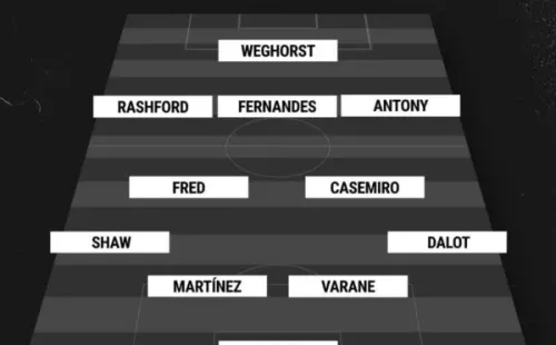 De Gea; Dalot, Varane, Martínez, Shaw; Fred, Casemiro; Antony, Fernandes, Rashford; Weghorts.