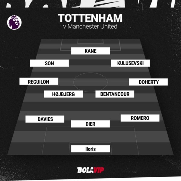 HugoLloris; CristianRomero, EricDier, BenDavies; MattDoherty, RodrigoBentancur, Pierre-EmileHøjbjerg, Sergio Reguilon; DejanKulusevski, HarryKane, SonHeung-Min.