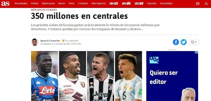Históricamente pensamos en las operaciones como esas relacionadas a los tantos y a esa frase que dice: “El gol se paga”. Si bien algunos de los principales fichajes de la presente ventana basan su existencia en dicho hecho, la realidad es que Europa empieza a mutar y como desvelan desde AS, los grandes clubes miran más hacía la zaga que al área contraria.