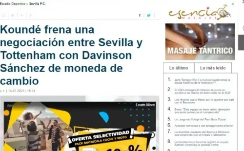 Estadio Deportivo, principal medio de la ciudad de Sevilla, asegura que Tottenham ha propuesto al rey de la Europa League un intercambio de fichas. Davinson Sánchez entraría en la operación para llevar a Jules Koundé a la Premier League por 30 millones de euros. De momento, el central del equipo español no habría aceptado las condiciones.