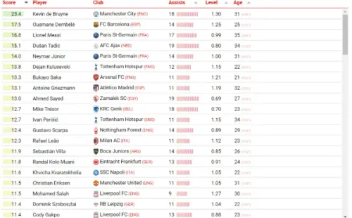 Sin embargo, CIES no solo expone quiénes fueron los jugadores con más asistencias, sino que asignan una puntuación a cada jugador en base al número de asistencias y el coeficiente de los partidos dusputados. Por ende, se valora la dificultad e importancia de los partidos jugados.