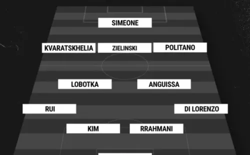 Meret; Di Lorenzo, Rrahmani, Kim Min-Jae, Rui; Zambo Anguissa, Lobotka; Politano, Zielinski, Kvaratskhelia; Simeone.
