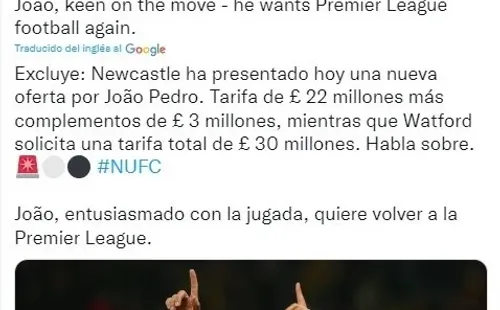 Precisamente, de acuerdo con el comunicador, el futbolista que interesa en el equipo que dirige, Eddie Howe, es el joven de 20 años brasileño, Joao Pedro, actualmente presta sus servicios a Watford, equipo de la Segunda División y que está esperando el ingreso de un dinero significativo por su futbolista.