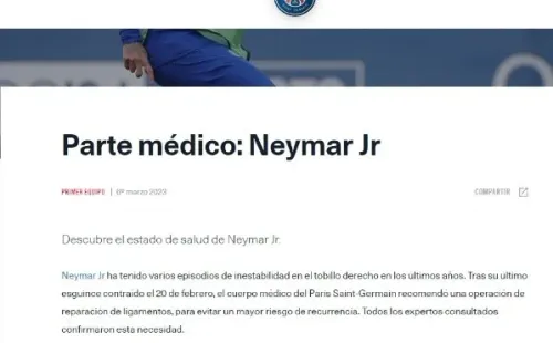 “Neymar Jr. ha tenido varios episodios de inestabilidad en el tobillo derecho en los últimos años. Tras su último esguince contraído el 20 de febrero, el cuerpo médico del Paris Saint-Germain recomendó una operación de reparación de ligamentos, para evitar un mayor riesgo de recurrencia. Todos los expertos consultados confirmaron esta necesidad. Esta cirugía se realizará en los próximos días en el Hospital ASPETAR de Doha. Se prevé un retraso de 3 a 4 meses antes de su regreso a los entrenamientos colectivos“, dice el comunicado médico que publicó el PSG.