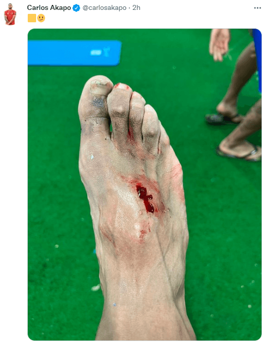 Luego del encuentro, Akapo publicó una foto en Twitter mostrando cómo le quedó el pie tras el planchazo de Hazard y se volvió viral por lo impresionante de la imagen. Además, acompañó la captura con una tarjeta amarilla, la sanción que recibió el jugador blanco, poniendo en duda la decisión del árbitro.