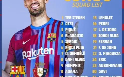 Ter Stegen, Dest, Piqué, Araujo, Sergio Busquets, Riqui Puig, Dembélé, Alves, Memphis, Adama, Braithwaite, Neto, Lenglet, Pedri, Luuk de Jong, Jordi Alba, Ferran Torres, Frenkie de Jong, Mingueza, Éric García, Aubameyang, Gavi y Arnau Tenas.