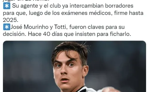 César Luis Merlo y TyC Sportsindicaron que el conjunto capitalino le acercó un ofrecimiento al argentino con contrato hasta junio de 2025 y un sueldo neto anual de 6 millones de euros. Dybala habría acordado verbalmente la oferta y su llegada podría cerrarse en los próximos días.