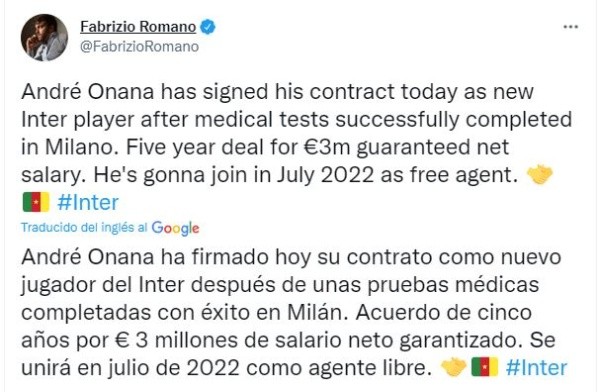 “André Onana ha firmado hoy su contrato como nuevo jugador del Inter después de unas pruebas médicas completadas con éxito en Milán. Acuerdo de cinco años por € 3 millones de salario neto garantizado. Se unirá en julio de 2022 como agente libre”, fue la información entregada por el periodista.