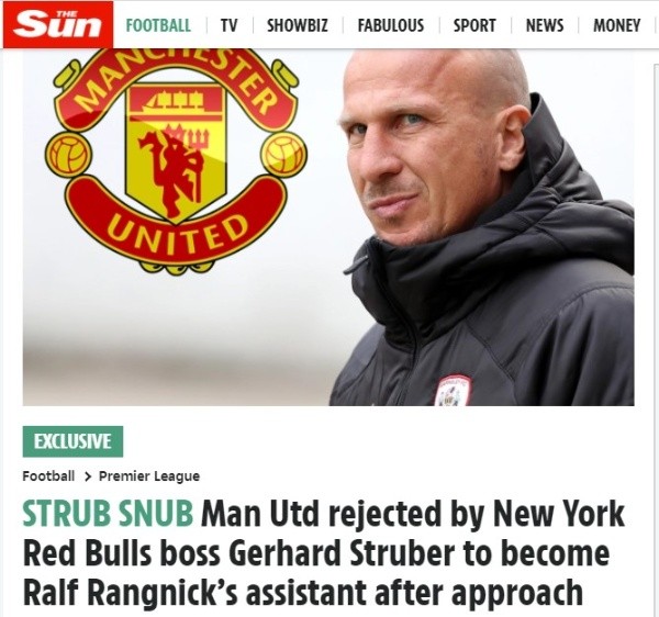 The Sun reporta que Ralf Rangnick buscó hacerse con los servicios del técnico austriaco Gerhard Struber para que este asumiese como segundo entrenador de los Red Devils. El actual DT de los New York Red Bulls ha desechado la oferta de quien fuese su mano derecha en las inferiores del RB Salzburgo.