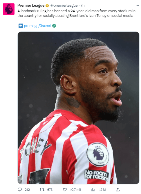 La Premier League se ha tomado en serio la lucha contra el racismo y ha tomado una drástica decisión sobre el fanático que publicó un mensaje racista en contra de Ivan Toney el pasado mes de octubre. La liga ha emitido una fuerte sanción contra el hincha.