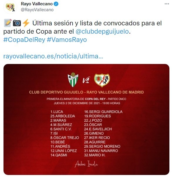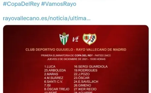 El partidoGuijelo vs. Rayo Vallecano se llevará a cabo HOY,jueves 2 de diciiembre,con sede enelEstadio Municipal Luis Ramos por la primera rondade laCopa del Rey.