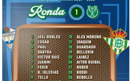 El partido Alicante vs. Real Betis se llevará a cabo HOY, miércoles 1° de diciembre, por la primera rondade la Copa del Rey. El duelo se desarrollará en el Estadio El Collao.