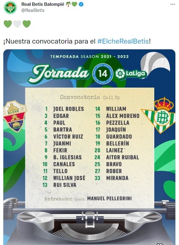 HOY | ONLINE | MINUTO A MINUTO | En el Estadio Martínez Valero, Elche yReal Betis, con la presencia de los mexicanosAndrés GuardadoyDiego Lainezen la convocatoria, afrontarán un nuevo desafío cuando se midan en el marco de la continuidad de la jornada 14 deLa Liga de España. El partido será transmitido EN VIVO para México a través de SKY Sports.