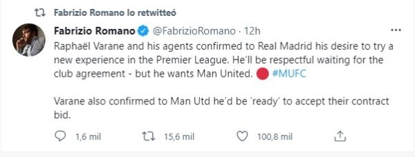 “Raphael Varane y sus agentes confirmaron al Real Madrid su deseo de probar una nueva experiencia en la Premier League. Será respetuoso esperando el acuerdo del club, pero quiere al Manchester United. Varane también confirmó a Man Utd que estaría ‘listo’ para aceptar su oferta de contrato”, publicaba el gurú del mercado de fichajes en sus redes sociales.