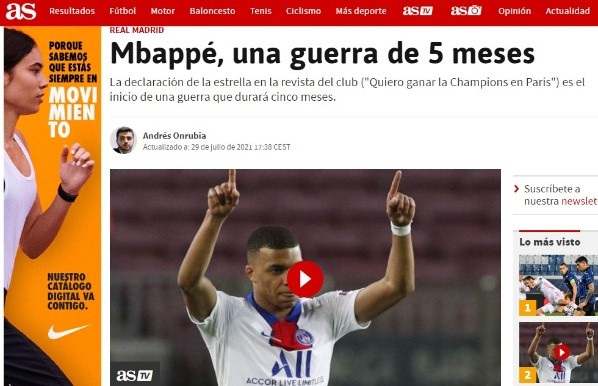 AS indica que al delantero no le molestó la publicación de la pieza audiovisual, sino justamente el momento para poner esta en las redes sociales. El medio de la capital española lo ve cómo un nuevo acto de presión sobre el futbolista y su entorno, quienes son constantemente asediados por la dirigencia y los medios para que Mbappé no viaje al Real Madrid.