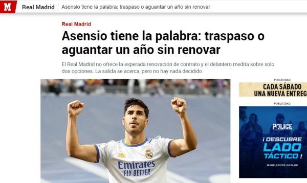 Correcto, MARCA asegura que Real Madrid no renovará al futbolista bajo esas peticiones y que Marco Asensio tiene hasta el domingo 3 de julio para anunciar si sale en la presente ventana de fichajes o como agente libre en el 2023. AC Milan suspira por sus goles, pero desde España pedirán como mínimo 30 millones de euros que no sobran en la capital de Lombardía.