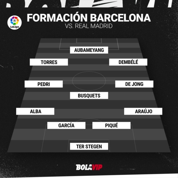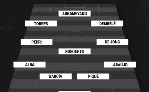 Marc-André ter Stegen; Jordi Alba, Eric García, Gerard Piqué, Ronald Araújo; Pedri, Sergio Busquets, Frenkie De Jong; Ferran Torres, Pierre-Emerick Aubameyang y Ousmané Dembélé