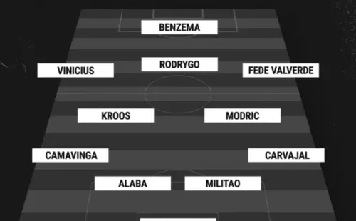 Thibaut Courtois, Dani Carvajal, Eder Militao, David Alaba, Eduardo Camavinga;Luka Modric, Toni Kroos;Federico Valverde, Rodrygo, Vinicius Júnior; y Karim Benzemalos nombres deun conjunto blanco donde Antonio Rudiger y Aurélien Tchouaméni serían moneda de cambio para la segunda mitad.
