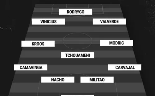 Thibaut Courtois; Dani Carvajal, Eder Militao, Nacho, Eduardo Camavinga; Toni Kroos, Aurélien Tchouaméni, Luka Modric; Federico Valverde, Vinicius Jr. y Rodrygo, los apuntados por estas horas para confirmar los planes de Carlo Ancelotti en un nuevo reto por LaLiga y donde Real Madrid no tiene margen de error en ningún sentido.