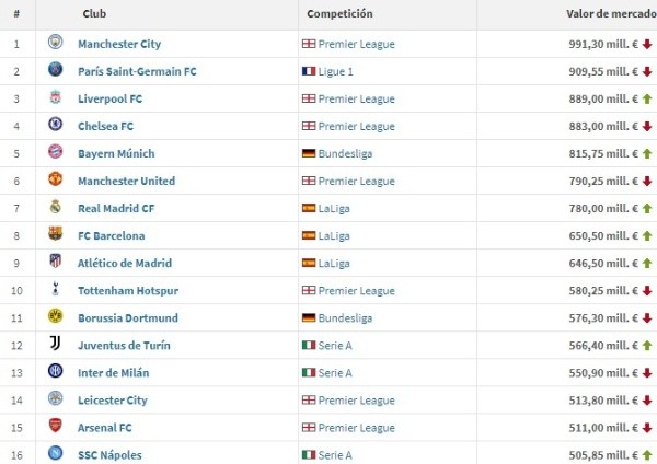 Manchester United (790 millones), Bayern Múnich (815 millones), Chelsea (883 millones), Liverpool (889 millones), PSG (905 millones) y Manchester City (991 millones), los planteles que superan el valor de un Real Madrid que para evitar en el futuro noches como la del Parque de Los Príncipes, se encuentra obligado a romper el mercado.