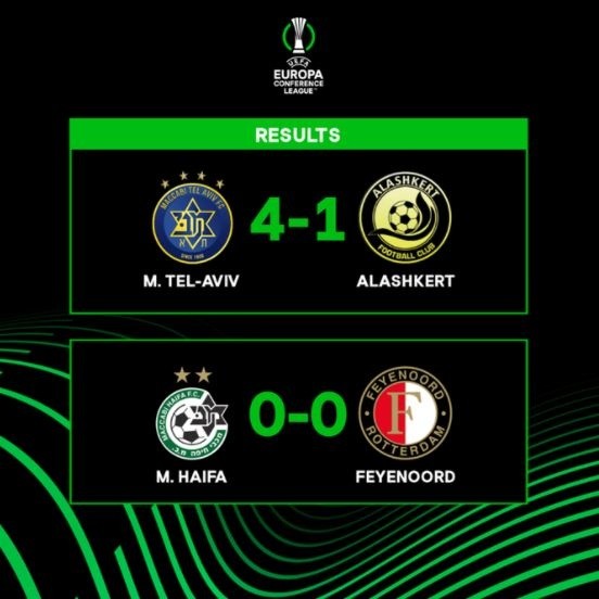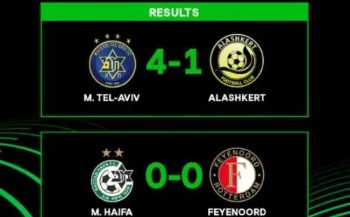 Otro equipo de Israel también jugó en su casa. Maccabi Haifa recibió a Feyenoord, de Países Bajos, sin embargo, ambos equipos no pasaron de la igualdad sin goles. Cabe recordar que en el equipo neerlandés jugó el futbolista internacional con Colombia, Luis Sinisterra.