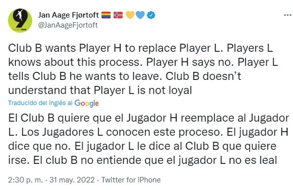 “El Club B (Bayern Múnich) quiere al Jugador H (Haaland) para reemplazar al Jugador L (Lewandowski). El Jugador L (Lewandowski) lo sabe. El Jugador H (Haaland) dice no. El Jugador L (Lewandowski) le dice al Club B (Bayern) que quiere marcharse. El Club B (Bayern) no entiende que el Jugador L (Lewandowski) no sea leal”, escribe en Twitter Jan Aage Fjortoft, amigo íntimo y portavoz la familia Haaland.