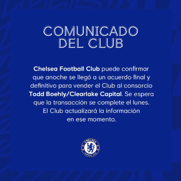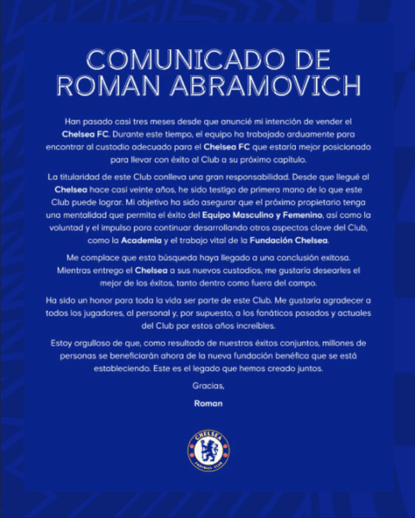 Abramovich lo confirmó a través de un comunicado en Twitter en la cuenta de Chelsea: “Me complace que esta búsqueda haya llegado a una conclusión exitosa. Mientras entrego el Chelsea a sus nuevos custodios, me gustaría desearles el mejor de los éxitos, tanto dentro como fuera del campo“.