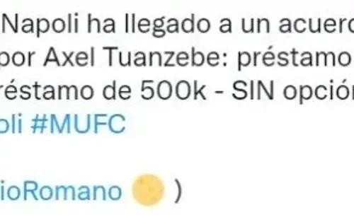 Fabrizio Romano, periodista italiano, afirmó en su cuenta de Twitter que: “HECHO: Napoli ha llegado a un acuerdo verbal con Man United por Axel Tuanzebe: préstamo hasta junio, € tarifa de préstamo de 500k – SIN opción de compra”, sobre el presente del defensa.