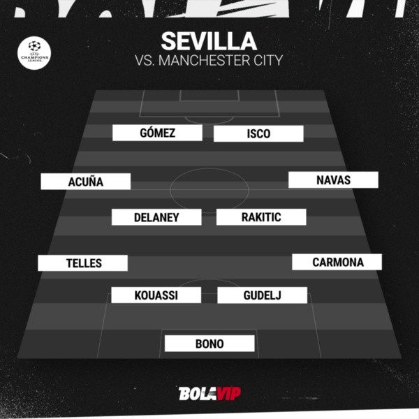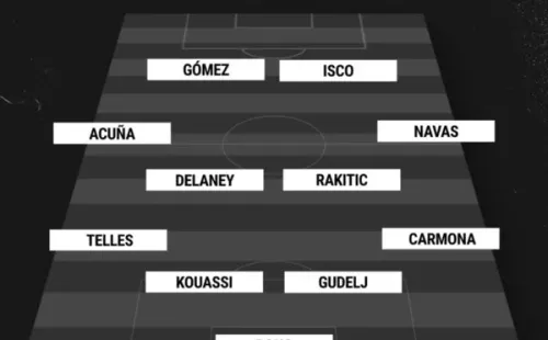 Bono; Carmona, Gudelj, Kouassi, Telles; Navas, Rakitic, Delaney, Acuña; Gómez, Isco.