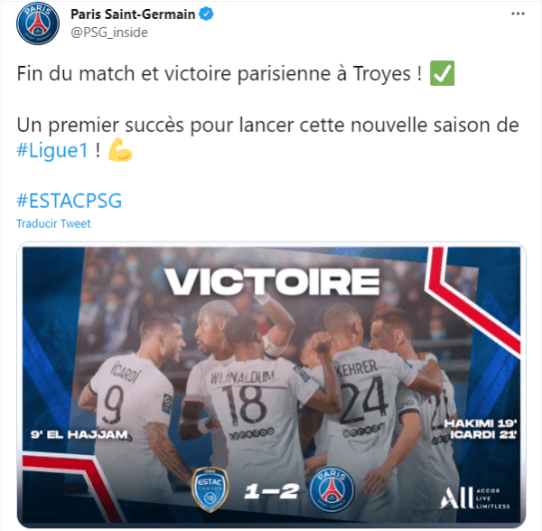 Este sábado inició oficialmente la Liga de Francia para PSG. En condición de visitante, vencieron 1-2 a Troyes, por la primera fecha del rentado local Galo. Achraf Hakimi y Mauro icardi, fueron los autores de los goles del equipo parisino. Oualid El Hajjam, fue el encargado de poner el primer gol de la noche, a favor del elenco recién ascendido.