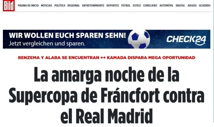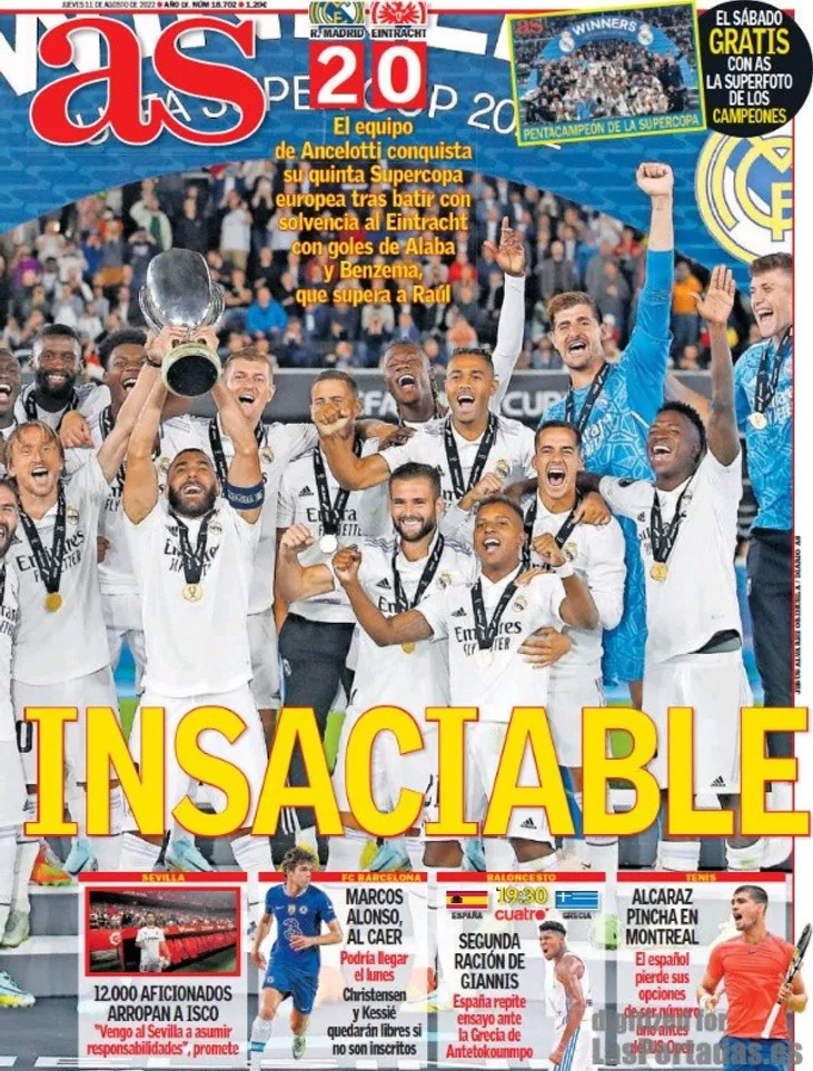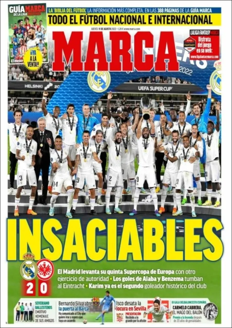 “Insaciables…Un Madrid insaciable…El Madrid gana el primer título del curso…La Supercopa también es blanca…La amarga noche de la Supercopa de Frankfurt contra Real Madrid”, los titulares y portadas de MARCA, AS, Sport, Mundo Deportivo y Bild para resumir una noche donde los Merengues sumaron una nueva estrella y donde superando los 97 títulos del Barcelona, vuelven a ser el equipo con más títulos en el fútbol español.