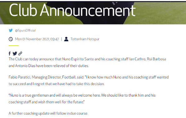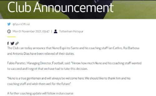 Nuno Espírito Santo, el entrenador del equipo londinense, es el máximo apuntado por los malos resultados del club y los dirigentes comenzaron a evaluar su destitución. Tras 10 fechas en el torneo doméstico, Tottenham cosechó cinco triunfos y cinco derrotas, que lo dejan ubicado en la octava posición.