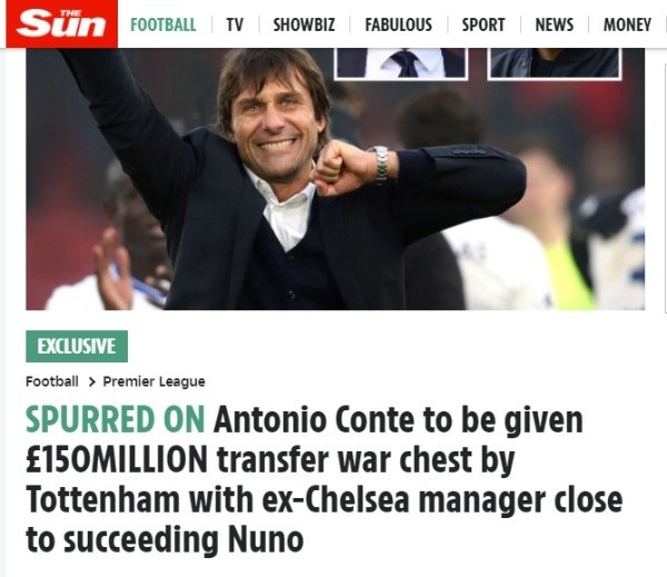 The Sun asegura que el ex Inter, Juventus y Chelsea ha estudiado el plantel que tendrá en Londres y quiere cambios. Conte cobrará cerca de 18 millones de euros, pero pide aún más para darle un giro de 180 grados a la situación que viven los Spurs en la Premier y el resto de las competencias. Hasta 150 kilos le darán los directivos a quien está llamado a devolver al equipo a sus mejores épocas.