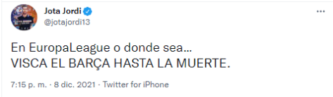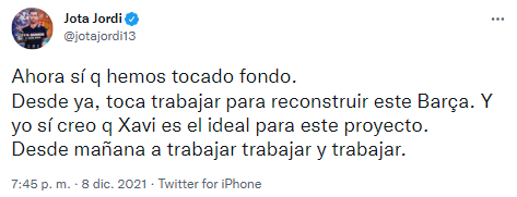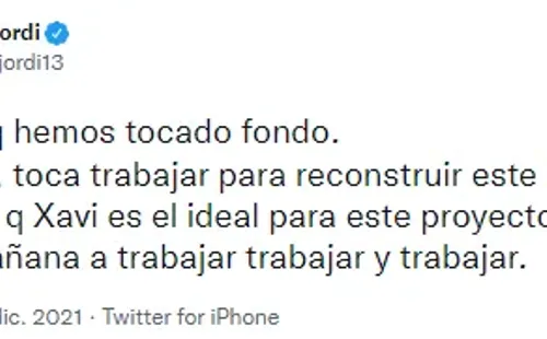 Tras el partido, con la eliminación confirmada, Jordi expresó su apoyo para Barcelona hacia el futuro con una serie de tweets: “En Europa League o dónde sea… Visca el Barça hasta la muerte“. Y luego apoyó a Xavi: “Ahora sí que hemos tocado fondo. Toca trabajar para reconstruir a este Barça y creo que Xavi es el ideal para este proyecto“.