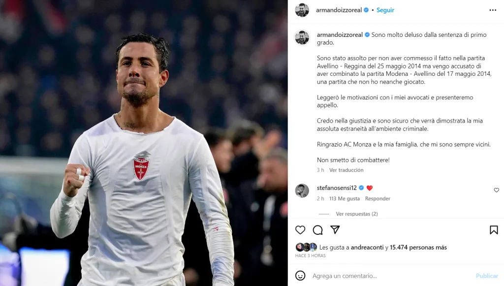 “AC Monza ha tenido conocimiento de que su integrante Armando Izzo ha sido condenado en primera instancia por competencia externa en una asociación de la Camorra y fraude deportivo y expresa total cercanía y apoyo a Armando, convencido de su no vinculación al medio delictivo” dice el comunicado de Monza.