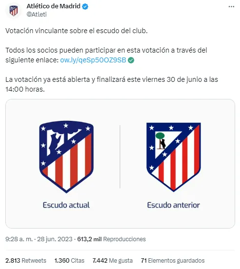 “En la última reunión de la Comisión Social, celebrada el jueves 22 de junio en el Cívitas Metropolitano, sus miembros propusieron la celebración de una consulta no vinculante para cuantificar el número de socios a los que les parecía conveniente que el club se plantease volver al anterior escudo” dice el club rojiblanco.